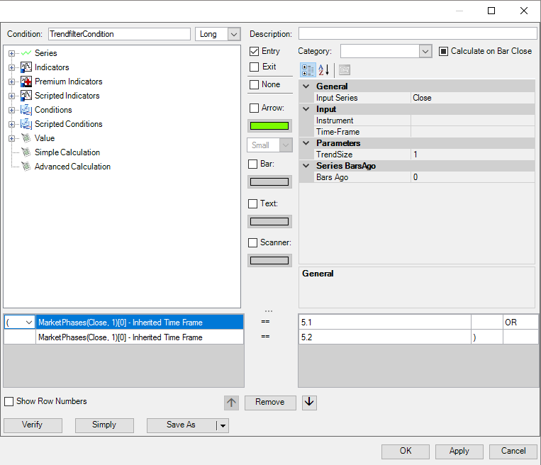 Important tip The scanner and chart use a different history calculation. Since Dow Theory indicators are very bar sensitive we cannot guarantee 100% synchronization between results show in the chart and the scanner. We recommend to reload the data in the scanner from time to time to avoid to big discrepancies. If you want to use MarketPhases (also Pro and Advanced version) indicator in conjunction with the scanner, the following settings are required: