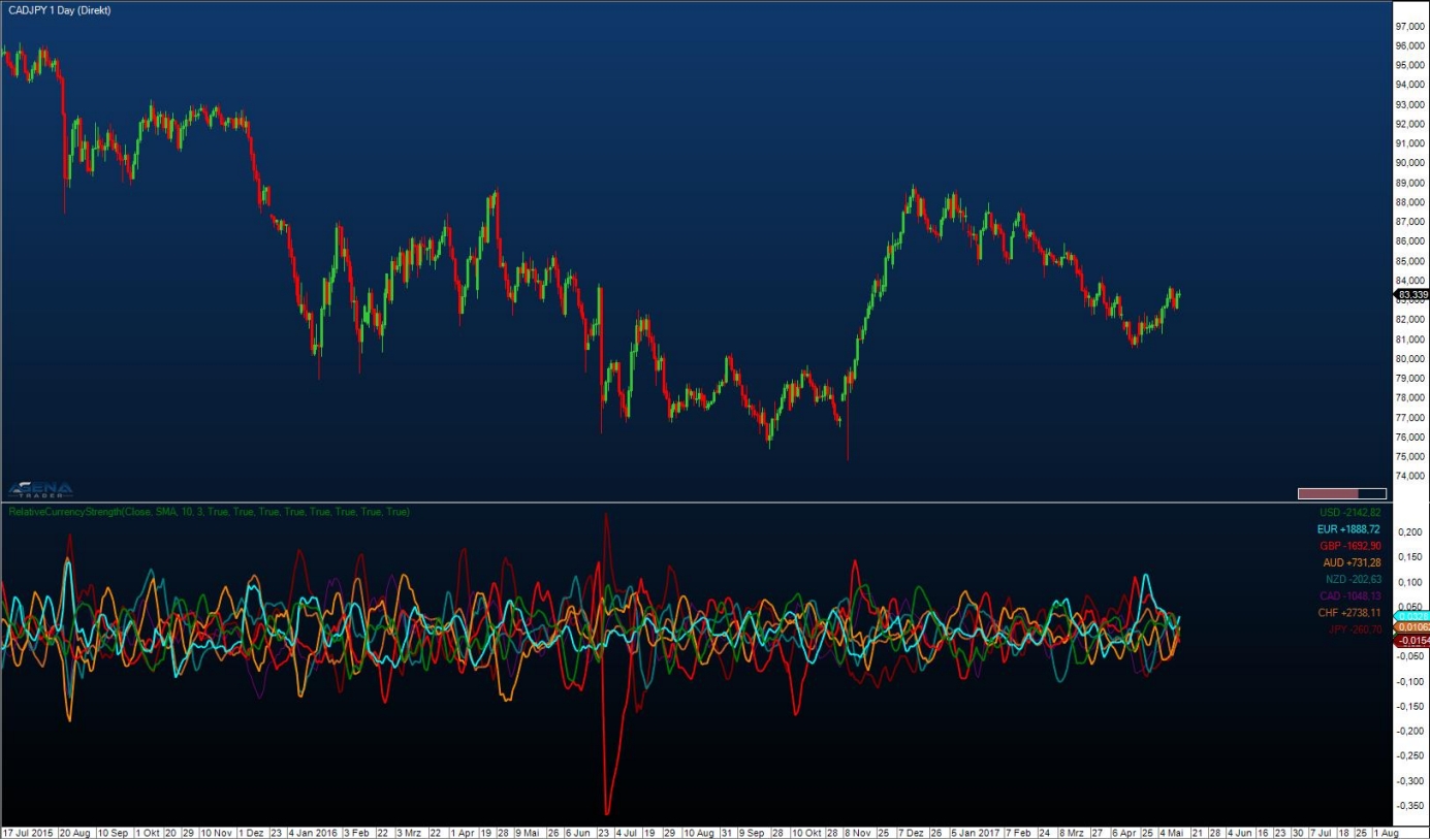 The basic idea of the RCS is based on finding the strongest and weakest currency in the present moment in a historical context. When you have all currencies displayed simultaneously, you can seek out the strongest and weakest currency in that moment. The strongest currency is the one whose line is currently the highest in comparison to the other lines; vice versa, you will find the weakest currency to be the lowest line at that moment. The currency pair that results from this is a potential trade candidate.