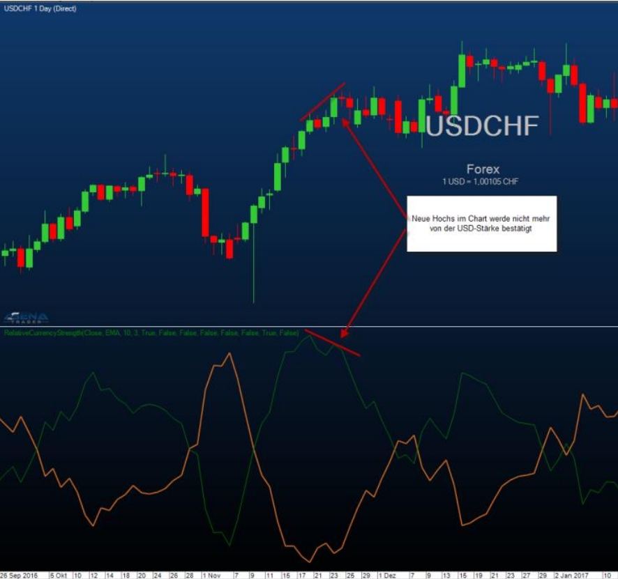 A divergence is formed when, for example, the chart forms new highs that are no longer confirmed by the strength of the RCG. In the example, the USDCHF forms new highs after a strong upward movement, which, however, are no longer confirmed by the USD strength of the RCS. After the divergence occurs, the USDCHF cannot continue its upward movement and transitions into a sideways phase. A divergence, therefore, can be used as an early indicator, for example to “foresee” the end of a longer movement.