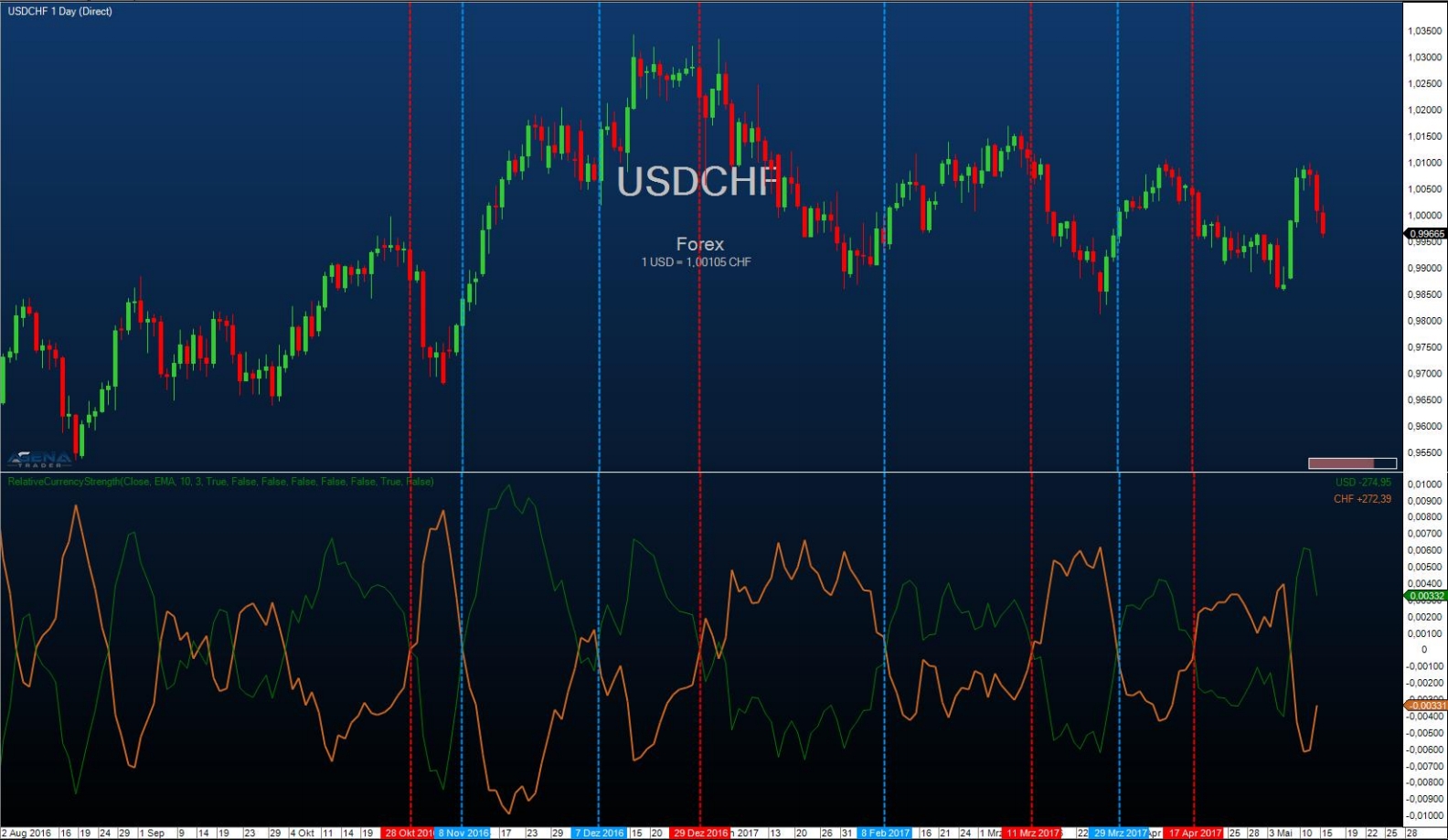 The overlapping of two currency lines can also be used as a signal. In the example, a long signal (blue) forms when the USD intersects the CHF line from bottom to top. A short signal is formed when the CHF intersects the USD line from top to bottom.