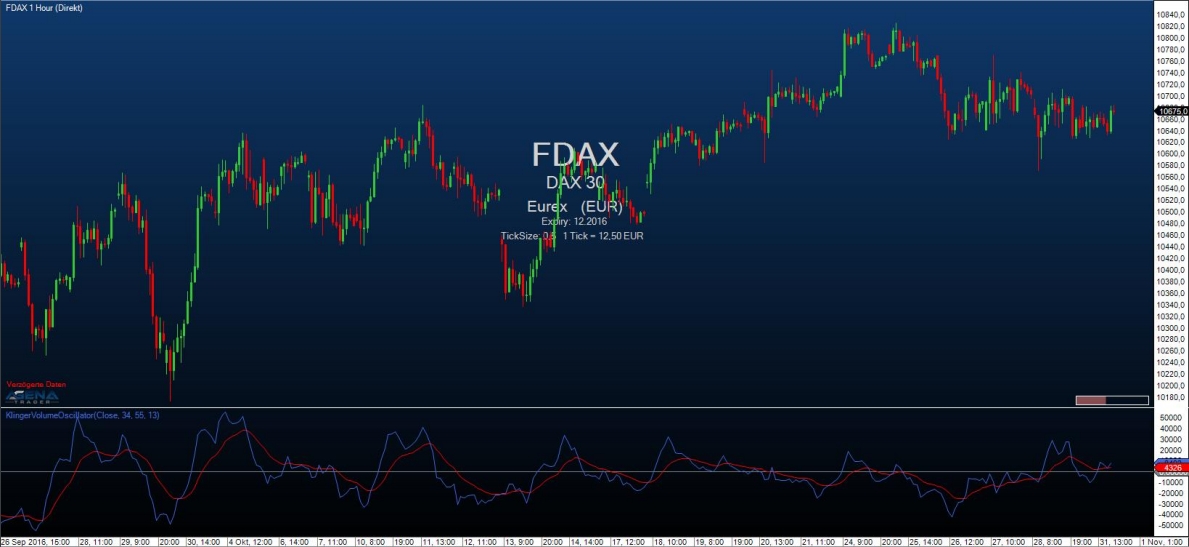 The KlingerVolumeOscillator is a technical indicator that was developed by Stephen Klinger in order to determine long-term trends of the money flow. At the same time, the indicator is sensitive enough to also identify short-term fluctuations, thereby giving the trader the possibility to detect even short-term reversals in the market. The indicator compares the influent and effluent volume of an instrument with its price movements, and is outputted as an oscillator. A signal line (13-period moving average) is used for generating signals. Divergences in the KlingerVolumeOscillator in comparison to the price movement can also be used for entry and exit decisions. A bullish signal is formed when the KlingerVolumeOscillator start to rise while the price continues to fall; the opposite goes for a bearish signal.