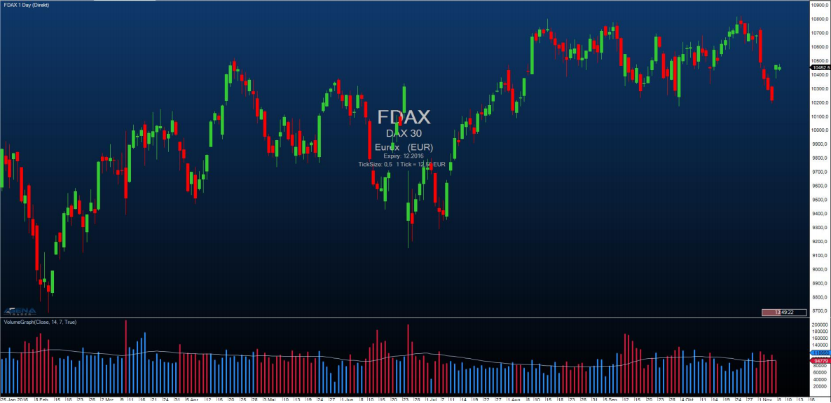 This indicator contains a normal volume histogram, but here, the coloring takes place based on price trends. The VolumeGraph determines short- or long-term price trends; you can set the sensitivity for this using the parameter “SlopeLength”. A high value delivers long-term trends; low values represent short-term price trends. Using the setting “Exponential”, you can select whether the calculation for trend determination should be based on an exponential (=True) or linear (=False) algorithm. This is about the fine-tuning, and no large changes should be expected with this parameter. In addition, the volume histogram also contains a moving average, for which you can enter the period using the parameter “AvgLength”.