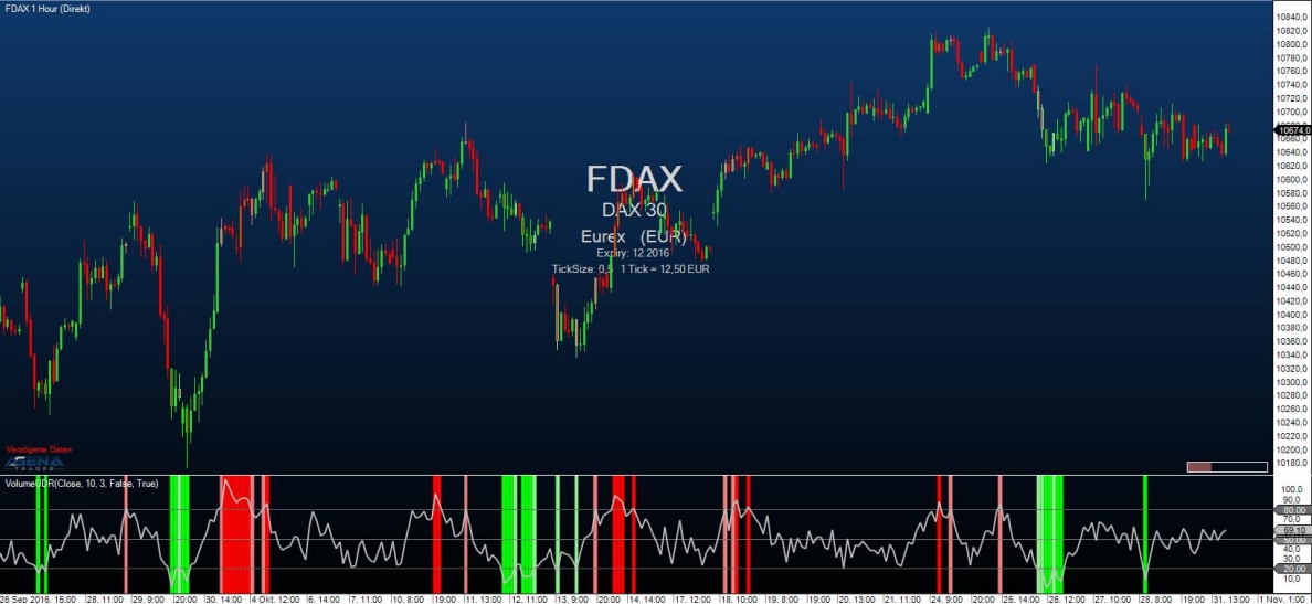 The VolumeUpDownRatio is the relationship between UpVolume and DownVolume, displayed as an oscillator. Volume is classified as UpVolume when the current close of the price candle is located above the close of the prior candle; the opposite applies for DownVolume. Values above 80 are to be graded as a bearish signal; values under 20 as a bullish signal. Besides this, a moving average can be shown, which can serve as an additional signal generator.