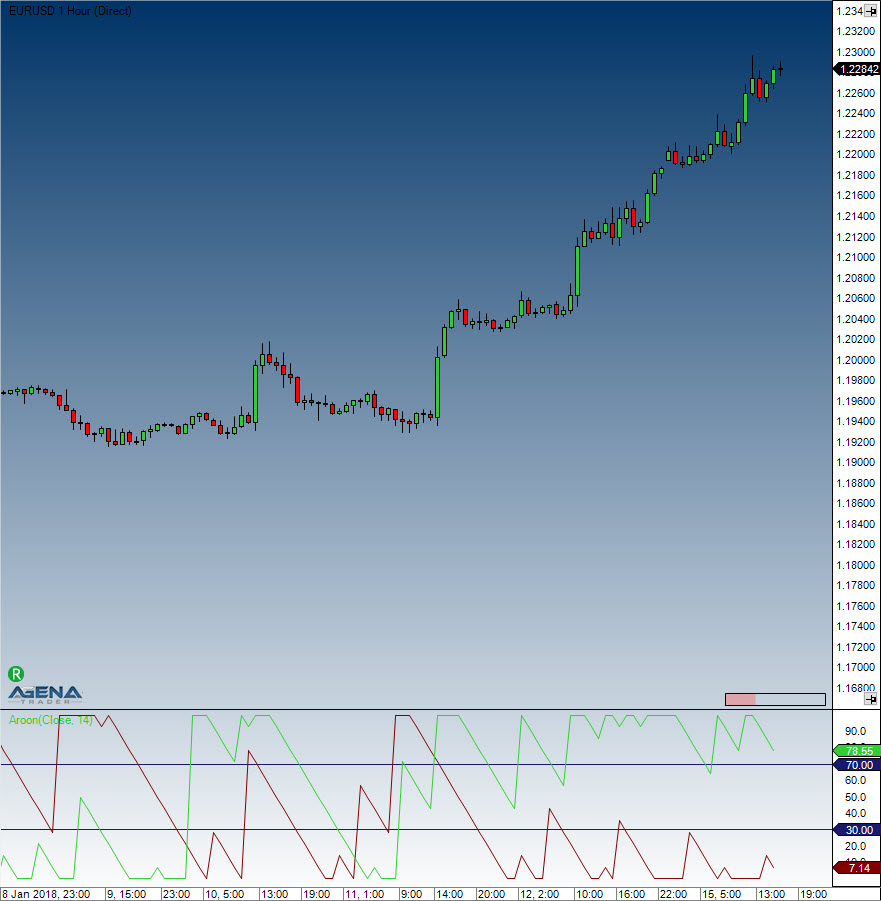 Aroon, an indicator system that determines whether or not a stock is trending and how strong this trend is, was developed by Tushar Chande in 1995. Its name is derived from the Sanskrit “dawn’s early light”. Chande used this name to signify the indicators’ purpose of revealing the start of a new trend. These indicators measure the number of periods since the last time the price recorded an x-day high or low. There are two distinct indicators: the Aroon-Up and Aroon-Down, whereby a 50-day Aroon-Up measures the number of days since a 50-day high, and a 50-day Aroon-Down measures the days since a 50-day low. This makes the Aroon indicators significantly different from the usual momentum oscillators, which concentrate on price in relation to time. What makes Aroon indicators unique is that they focus on time in relation to price. Aroon indicators can be used to detect emerging trends, identify consolidations, anticipate reversals and define correction periods.