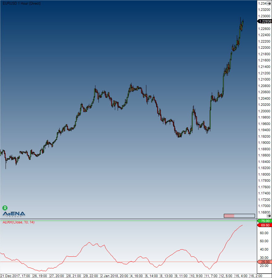 The oscillator moves along a guiding line that typically has a value of 20. When the ADXR rises above 20, a trend exists. If the ADXR is below 20, no trend exists and the market is moving sideways. Welles Wilder recommends buying into the market at a value of 25 and higher, and holding the position as long as the value remains above 20.