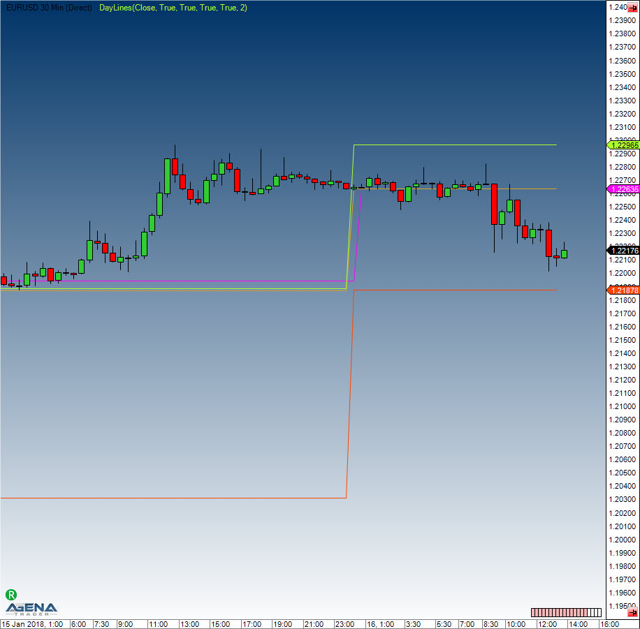 The DayLines indicator draws lines for the previous day’s high, low, and close. It also draws a line for the current day’s open. These lines often show a reaction to the market. Each line can be turned on or off, and the colors and line strengths can be freely set.