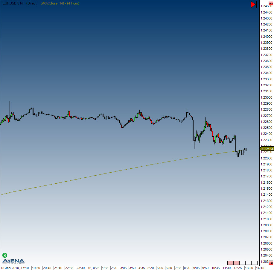 The image shows a 5-minute chart with an SMA (14) calculated on 4-hour bars