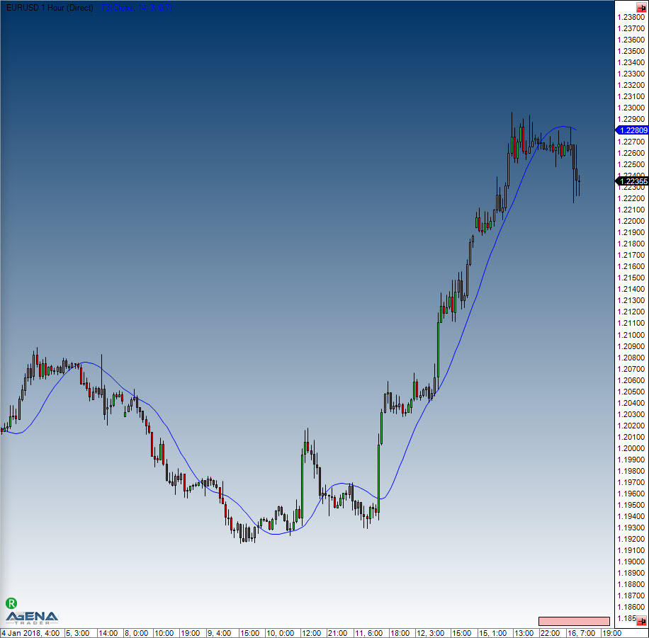 The Triple Exponential Moving Average T3 indicator (also dubbed the T3MA) is calculated by taking the weighted sums of a simple, a double, and a triple EMA. This produces a smooth, soft indicator line. The parameter tCount allows the trader to set the number of reiterations. The calculation is the same as the calculation for the DEMA, with the slight difference that here, a volume factor is also added. It accepts values between 0 and 1 (default: 0.7).