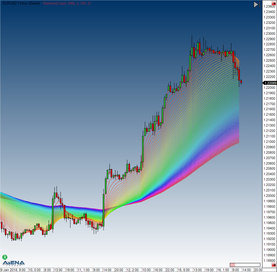 The rainbow indicator is represented by the set of the moving average indicator lines. Each of these lines is placed closer or further from the chart depending on the time period taken into the account for calculation of moving averages.