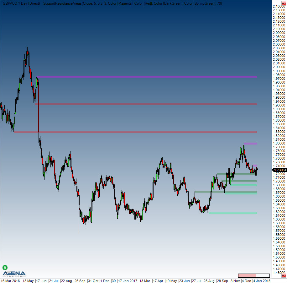 This indicator draws support and resistance areas in the chart. There are 4 different types of possible supports and resistances, which are differentiated by various colors.