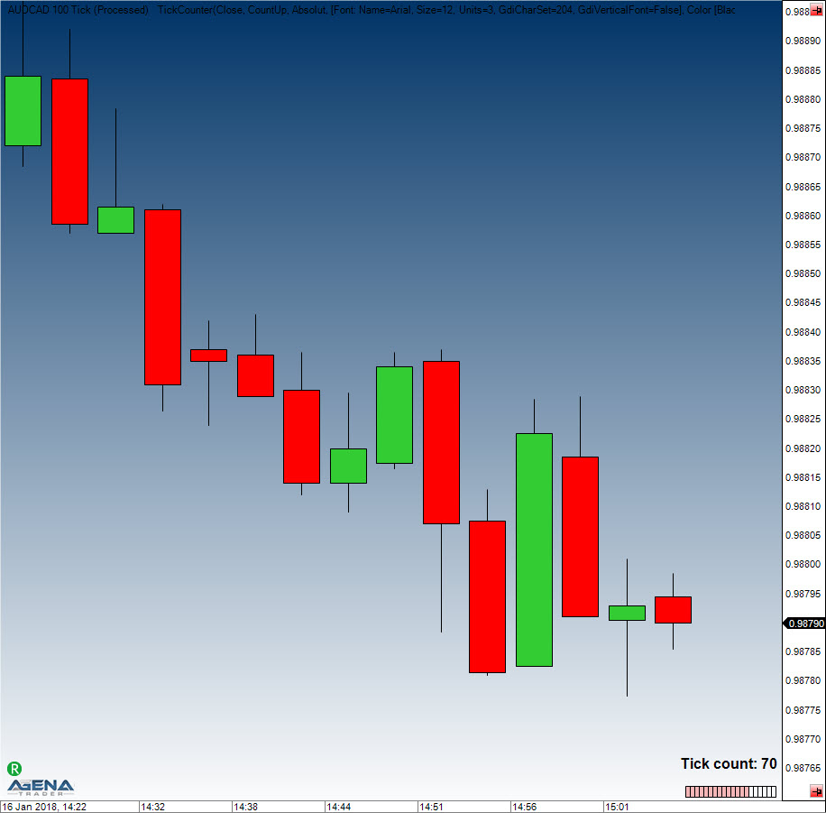 TickCounter provides information regarding the current number of ticks that are contained within the bar. The indicator can not only count starting from 0, but can also be set to count from a specified number down to 0. TickCounter can display the value either as absolute or as a percentage. It only works with candle charts in which the bars are established based on a fixed number of ticks.